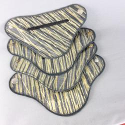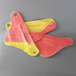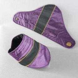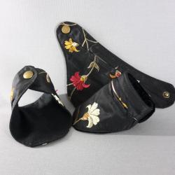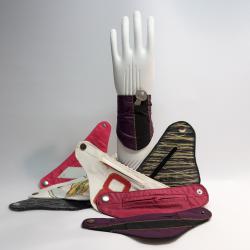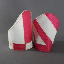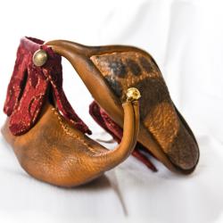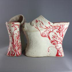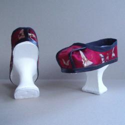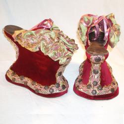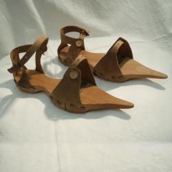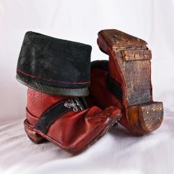 Ursprünglich Stelzpantoffel aus dem Orient, deren Sohle gut einen halben Meter Höhe messen konnte. Sie wurden in Italien und Spanien über einen Zeitraum von ca. 200 Jahren getragen. Die Sohlen wuchsen im 15.Jhd. zu erstaunlichen Höhen von über einem halben Meter an. Das rot-grüne und braune Paar sind für die Sonderausstellung "Schuhtick" entstanden, ebenso wie die nachfolgenden Trippen, Calligae, Mandschu-Schuhe. Das weiße Paar ist eine freie Variation, lederbezogen und bemalt.